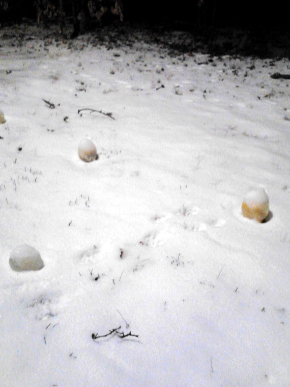About 2 weeks later we stopped by to pick up our snowmobiles on our way to an adults only trip and even though we had a huge fluctuation in weather with some 50 degree days and rain in between snow storms, shrunken versions of our ice marbles remained intact. These would be a pretty winter yard ornament or object to place in a bird feeder in the garden over the winter in place of a gazing ball!
